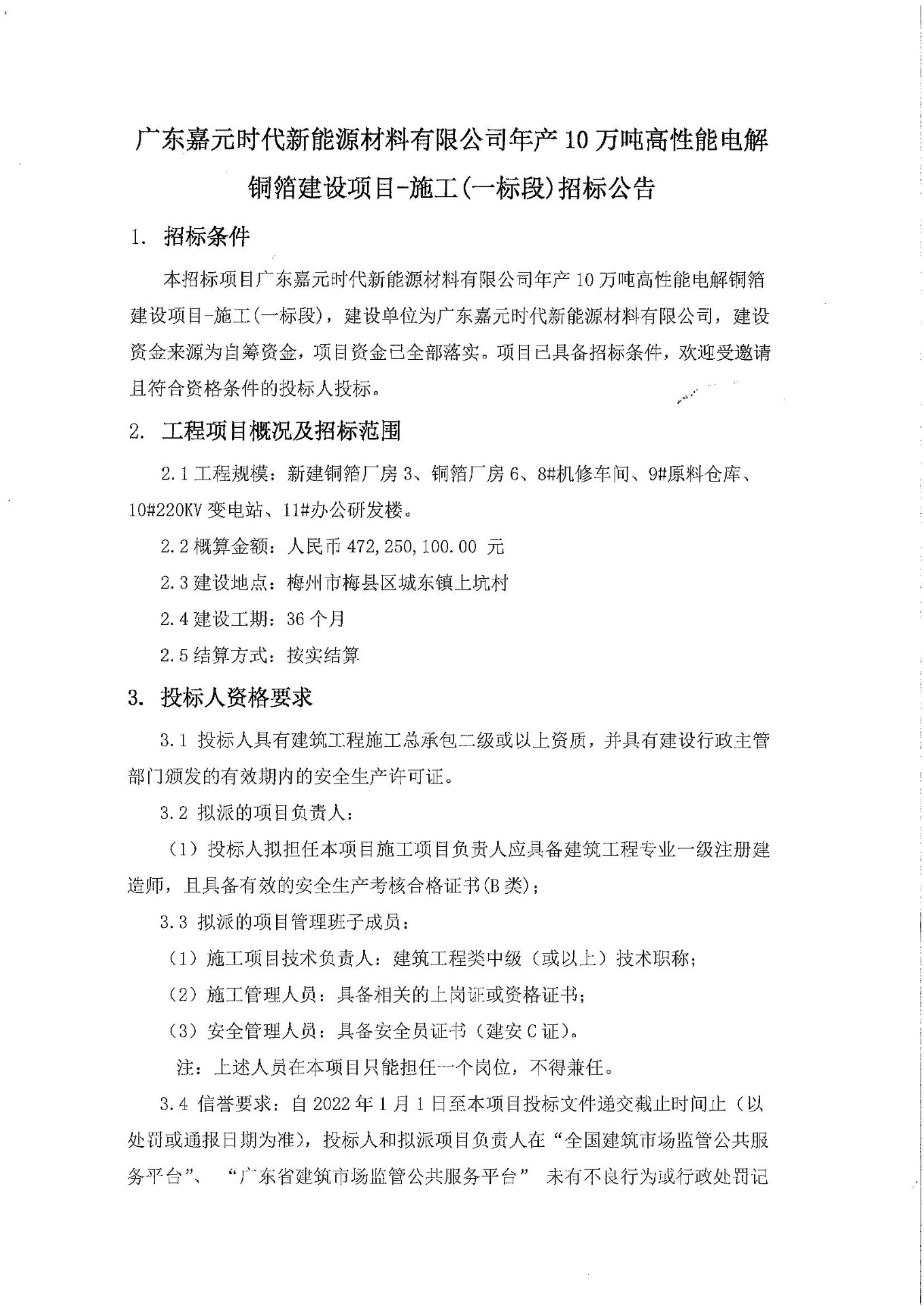 广东beats365亚洲版官网时代新能源材料有限公司年产10万吨高性能电解铜箔建设项目-施工(一标段)招标公告