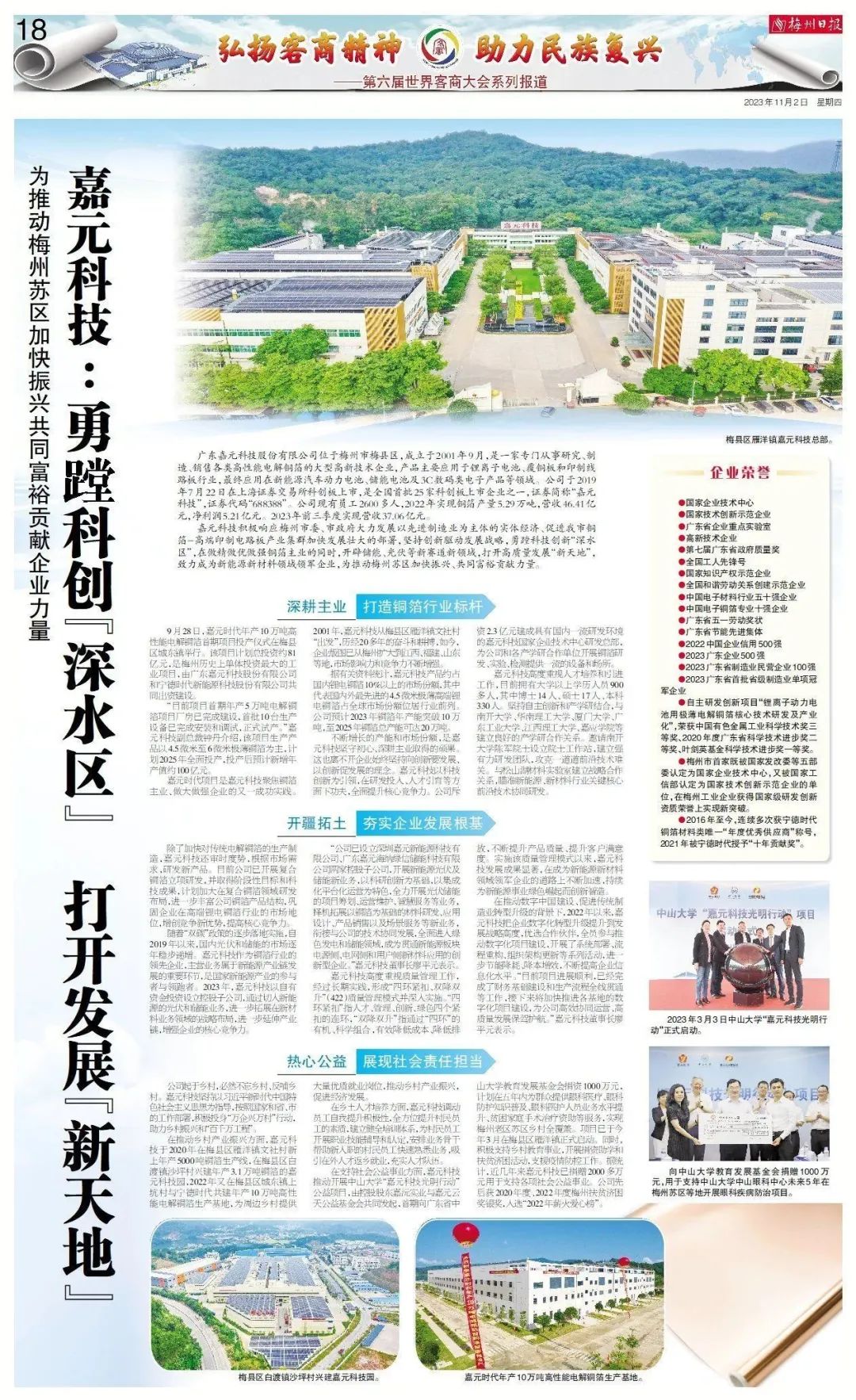 在推动乡村产业振兴方面,beats365亚洲版官网于2020年在梅县区雁洋镇文社村新上年产5000吨铜箔生产线,在梅县区白渡镇沙坪村兴建年产3.1万吨铜箔的beats365亚洲版官网园,2022年又在梅县区城东镇上坑村与宁德时代共建年产10万吨高性能电解铜箔生产基地,为周边乡村提供大量优质就业岗位,推动乡村产业振兴,促进经济发展。