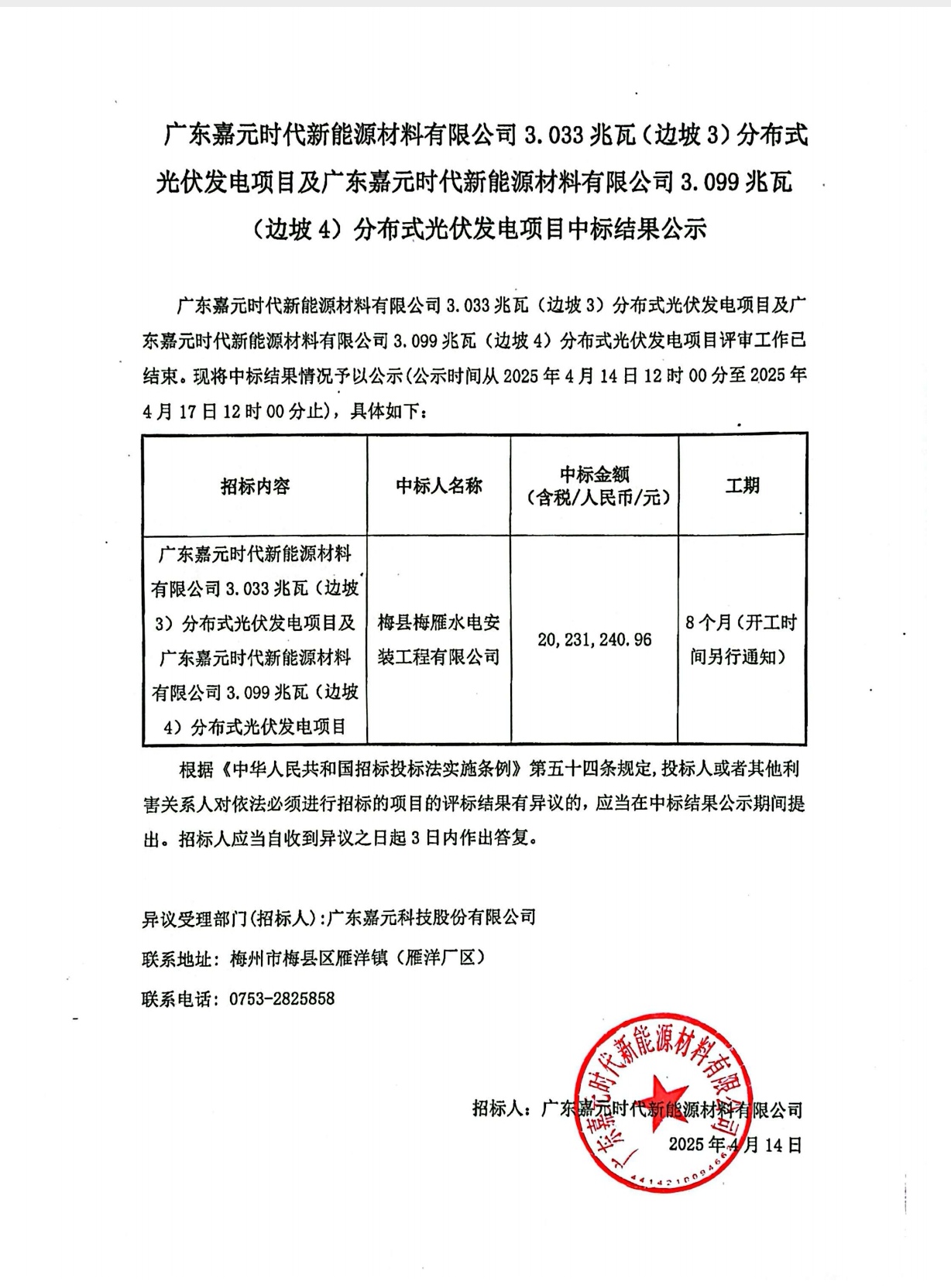 《广东beats365亚洲版官网时代新能源材料有限公司3.033兆瓦(边坡3)分布式光伏发电项目及广东beats365亚洲版官网时代新能源材料有限公司3.099兆瓦 (边坡4)分布式光伏发电项目中标结果公示》